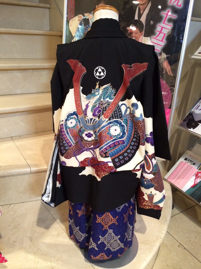5歳男の子の羽織袴の背中には・・・定番の「かぶと」柄