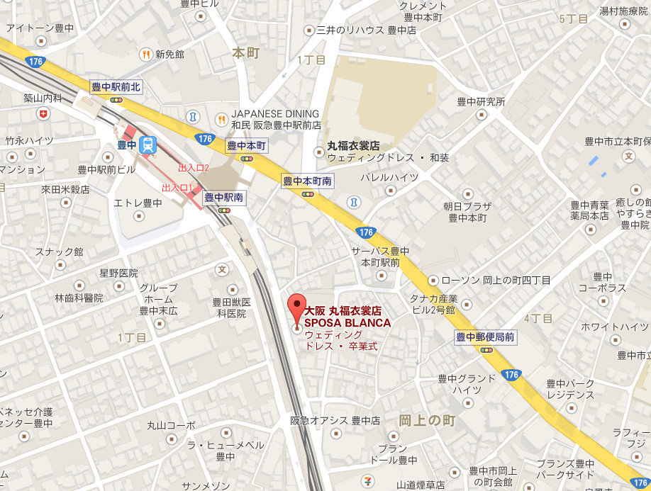 阪急豊中駅より電車の高架沿いに南へ約50M、左手にある白い5階建てのビルが 丸福衣裳店 本店です。無料駐車場有り。